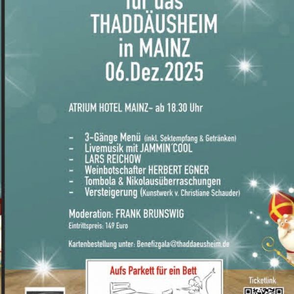 Zu einer ganz besonderen Benefizveranstaltung lud der Freundeskreis Thaddäusheim am Samstag, 9.11.2024, ins Hyatt Regency Mainz ein. Sektempfang, Live-Musik, ein 3-Gänge-Menü und Tanz erwarten die Besucher*innen.